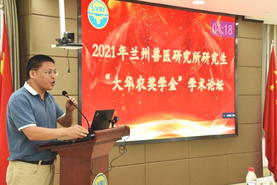 2021年7月20日,2021年(第八届)“大华农奖学金”学术论坛在兰州兽医研究所综合楼五楼学术报告厅举行。肇庆大华农生物药品有限公司副总裁王阿明、兰州兽医研究所所长郑海学、副所长罗建勋出席论坛开幕式。兰州大学基础医学院方泉教授、兰州大学生命科学学院张文华教授、中国农业科学院都市农业研究所王琦研究员及我所朱紫祥研究员和牛庆丽副研究员担任论坛评委。我所博硕士研究生及第五届优秀大学生暑期夏令营营员共计60余人参加本次论坛。