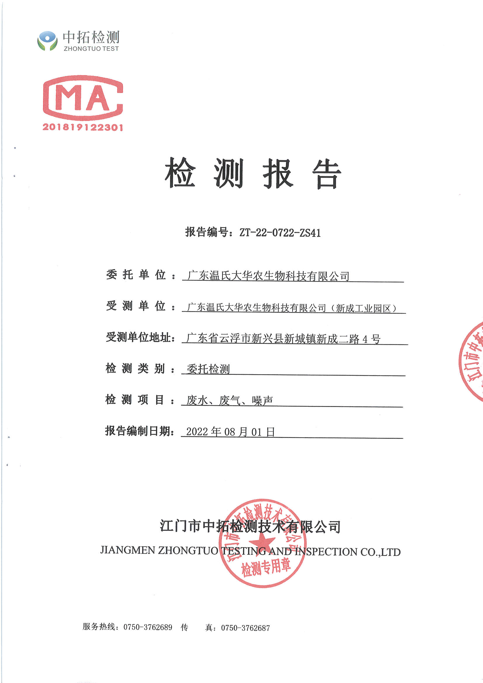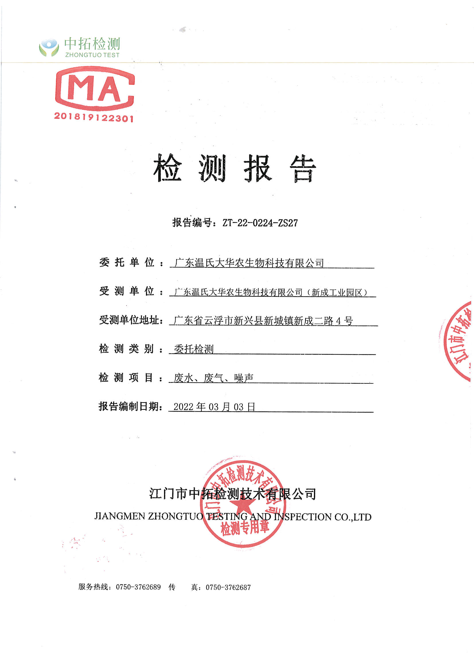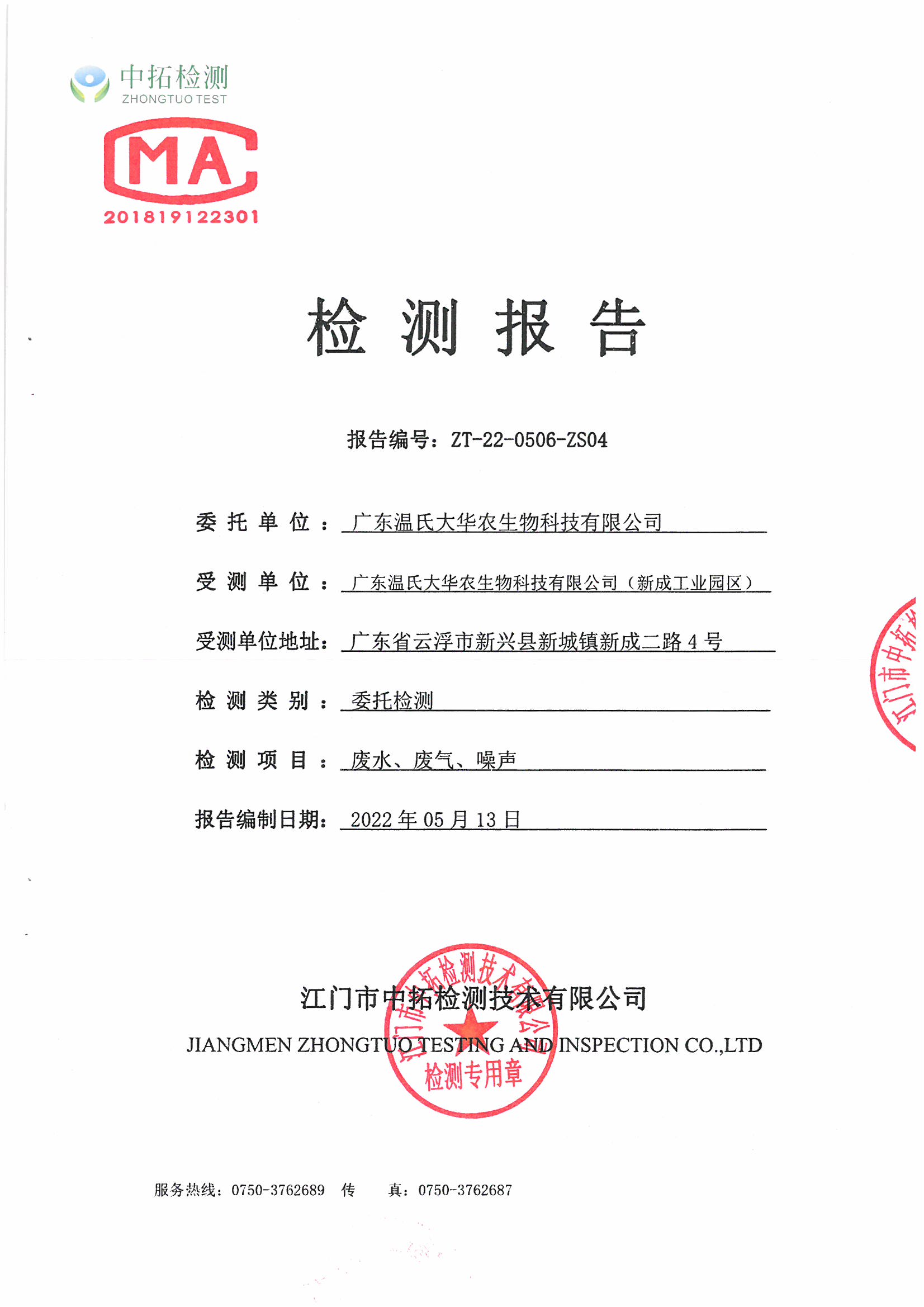 广东温氏大华农生物科技有限公司(工业园区)环境监测报告2022