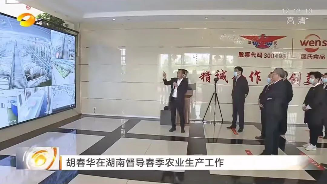中共中央政治局委员、国务院副总理胡春华13日至15日在湖南省永州市和邵阳市实地督导春季农业生产工作。在永州温氏调研时,温氏股份总裁梁志雄陪同胡春华副总理通过视频实时查看了温氏生猪养殖小区的生产情况,并向胡春华副总理汇报了温氏通过“公司+农户”模式带动农户致富,做好新冠疫情和非洲猪瘟疫情防控,保障稳产保供等方面的工作。
